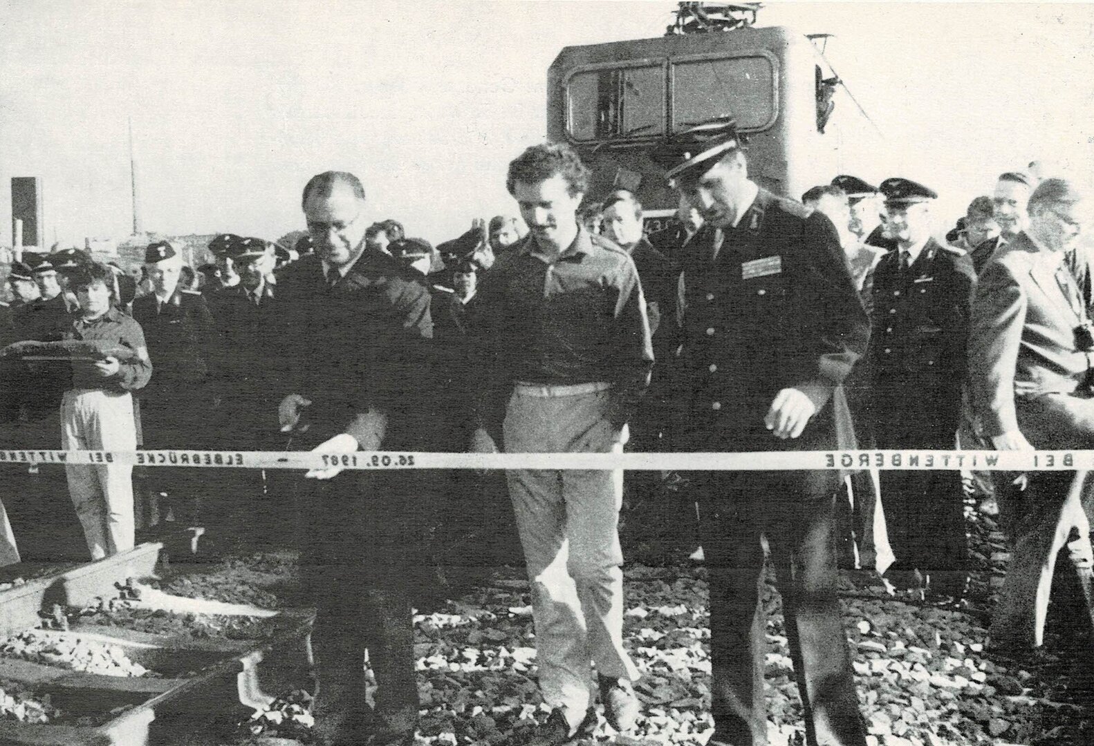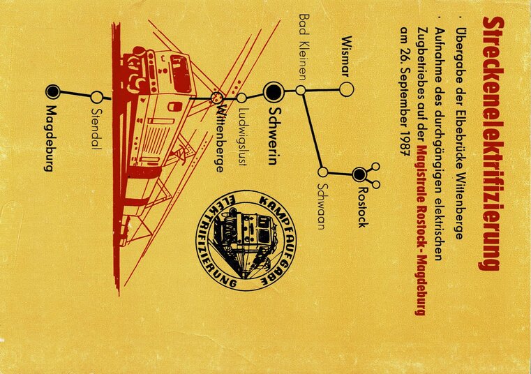 schaffenden konnte am 26. September 1987 mit der Fertigstellung der Elbebrücke Wittenberge der durchgängige elektrische Zugbetrieb auf derMagistrale Rostock—Magdeburg zu Ehren des 38. Jahrestages der Gründung der DDR aufgenommen werden.