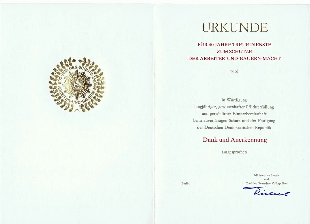 Urkunde für 40 Jahre Treue Dienste (MdI) |